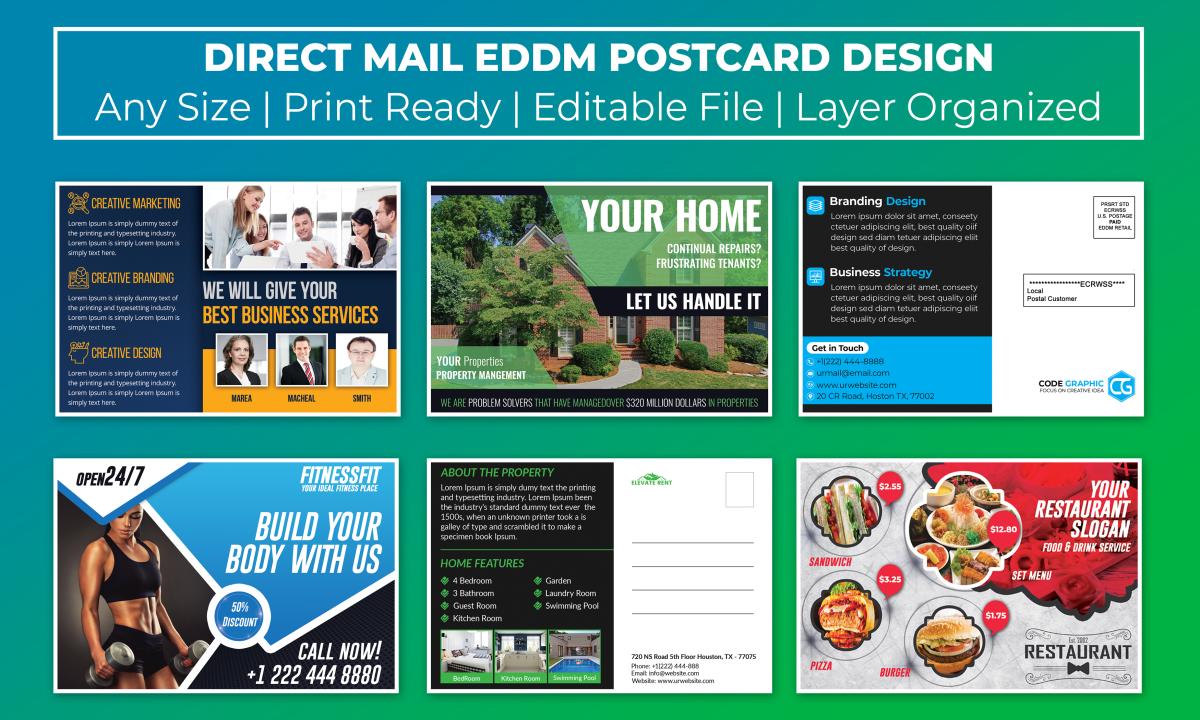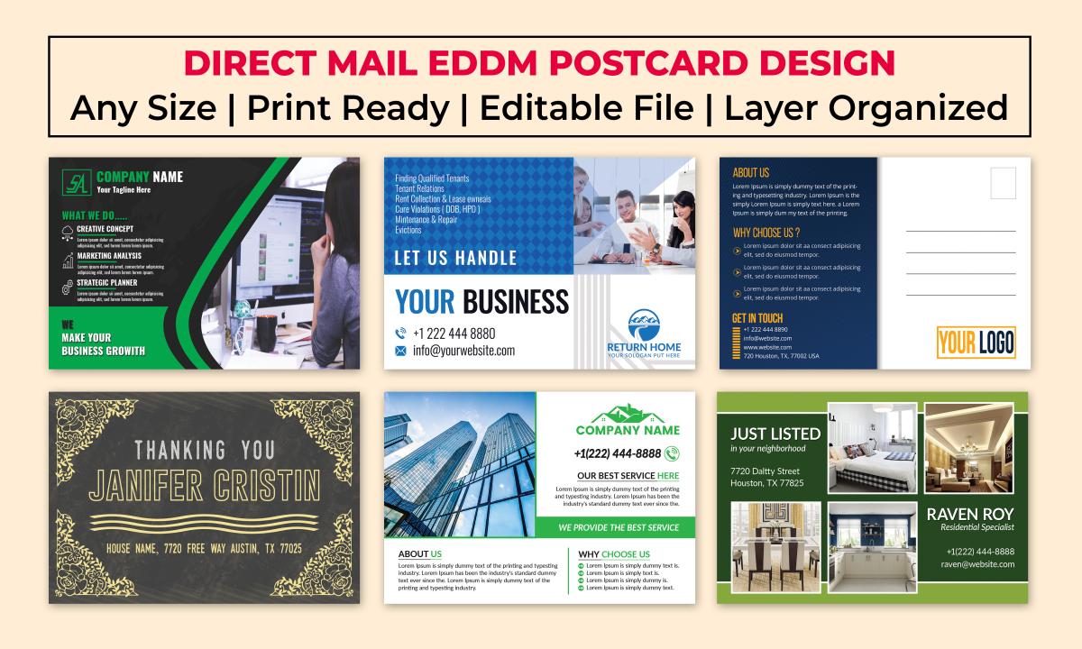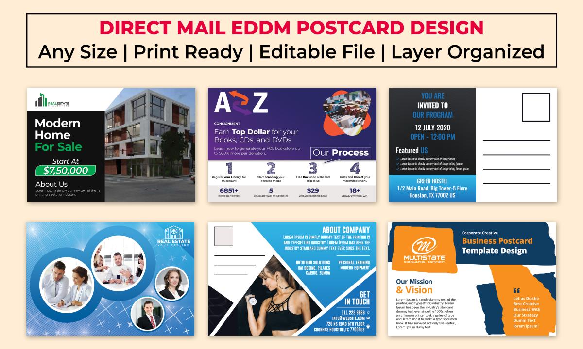 I will make for you a business, Creative, Modern, Real Estate, Gym & Fitness, Invite, Party, Celebrity, Corporate, Fantastic, Professional, Unique, Promotional, Holiday, Personal, Church, Any More design and Direct Mail EDDM Postcard design service as your wish you. I will design postcard, promotional direct mail eddm, poster, flyer.
