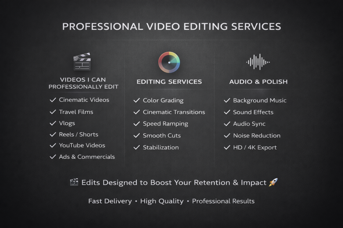 I am a creative video editor specializing in cinematic editing, beat sync cuts, smooth transitions, and professional color grading. Whether its for Instagram Reels, TikTok, YouTube Shorts, promos, or brand content, I turn raw clips into engaging, high-quality videos that feel modern and premium.