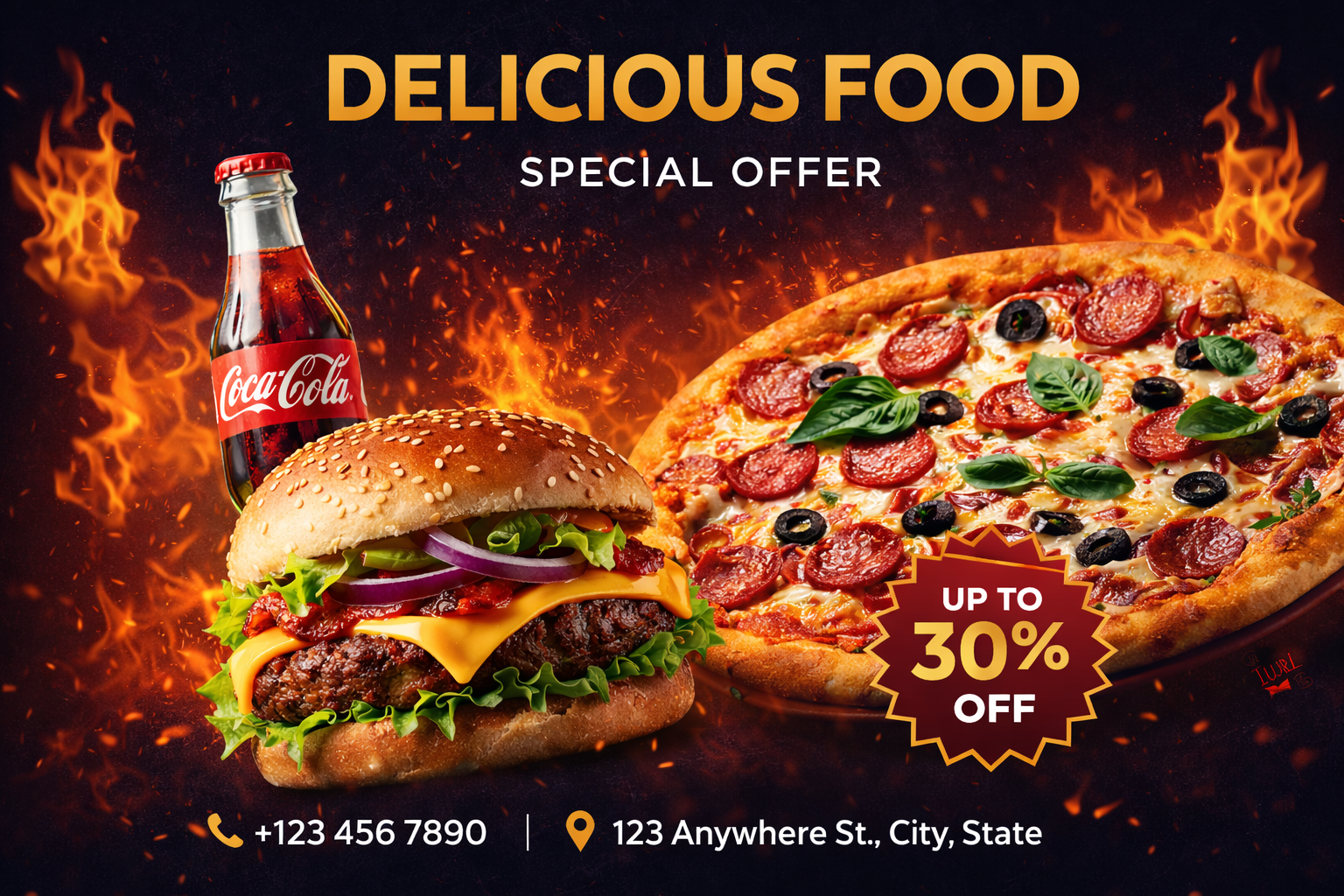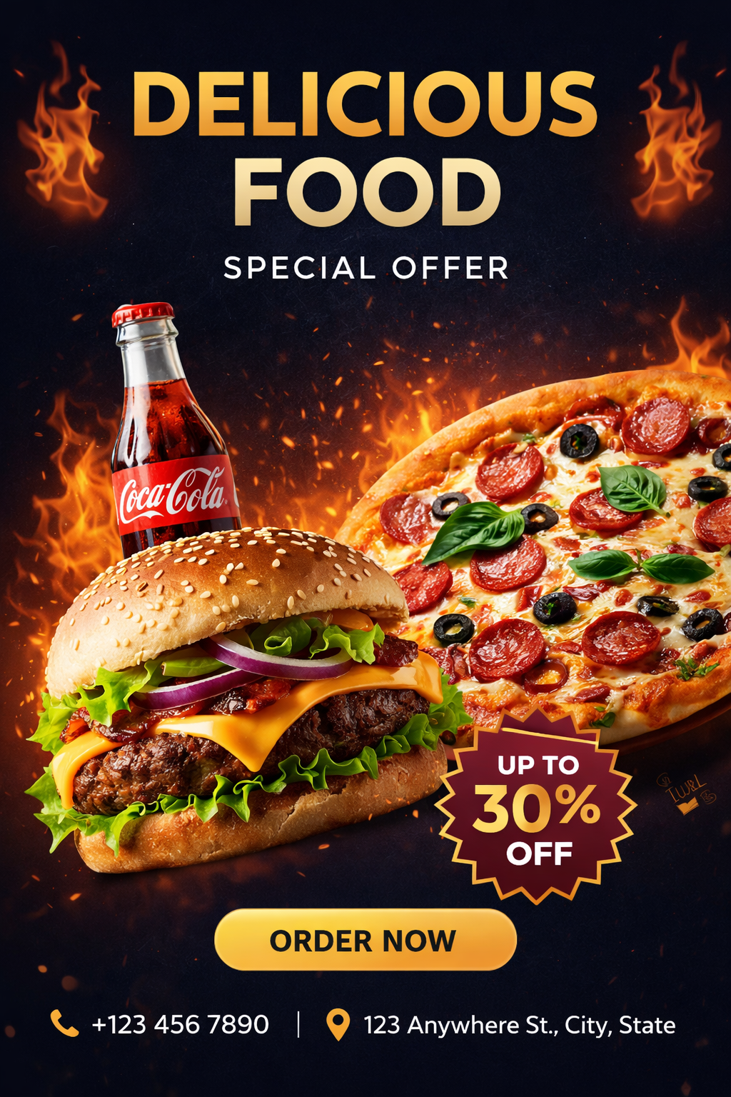 This premium restaurant promotional poster is strategically designed to capture attention, stimulate appetite, and drive immediate customer action. Showcasing a juicy gourmet burger, freshly baked pepperoni pizza, and a chilled Coke, the design highlights an irresistible “Up to 30% Off” special offer to encourage higher engagement and boost sales. The bold headline typography combined with dynamic flame elements creates excitement, energy, and a sense of indulgence that instantly attracts viewers.