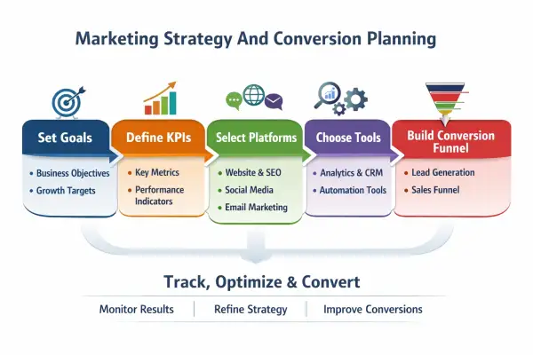 What this service includes is a clear marketing strategy outline basic SEO foundation analytics and tracking setup conversion funnel planning and platform recommendations. You will get clarity on how users should move from discovery to conversion and how performance should be measured.