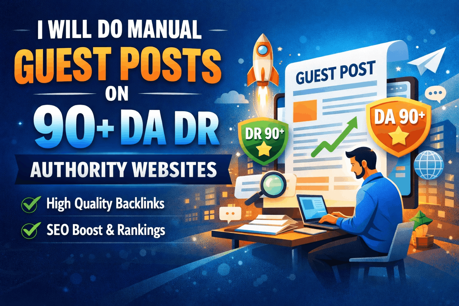 I will publish guest posts on high authority websites with 90+ DA/DR metrics. These placements help strengthen your backlink profile, improve domain authority, and increase your website’s visibility in search engines.