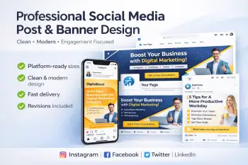 I design professional social media posts and banners that are eye-catching, modern, and engagement-focused, helping brands communicate clearly and stand out on digital platforms. Every design is created with attention to detail, visual balance, and platform-specific requirements to ensure strong performance across social media.