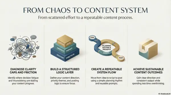 This is best for creators, solo founders, and small teams who already value content but feel stuck with inconsistency, overthinking, or scattered processes. If content matters to your growth, this will add clarity.