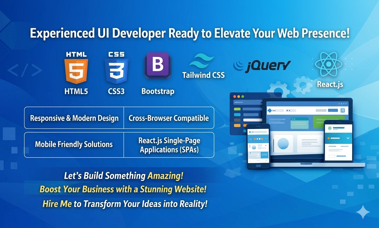 I provide modern, clean, and fully responsive frontend development using HTML5, CSS3, Tailwind CSS, and Bootstrap. I also have experience with React JS for building dynamic and interactive user interfaces. I focus on creating user friendly designs that work smoothly across all devices, including mobile, tablet, and desktop.
