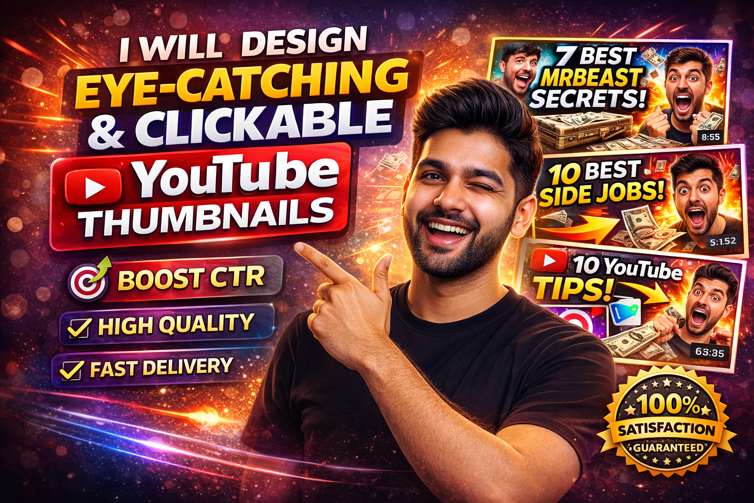 I will design high-quality, eye-catching, and professionally crafted thumbnails that are specifically created to increase your video’s click-through rate (CTR) and attract more viewers. A thumbnail is the first thing people notice, and I focus on making designs that instantly grab attention, create curiosity, and clearly represent your video content.