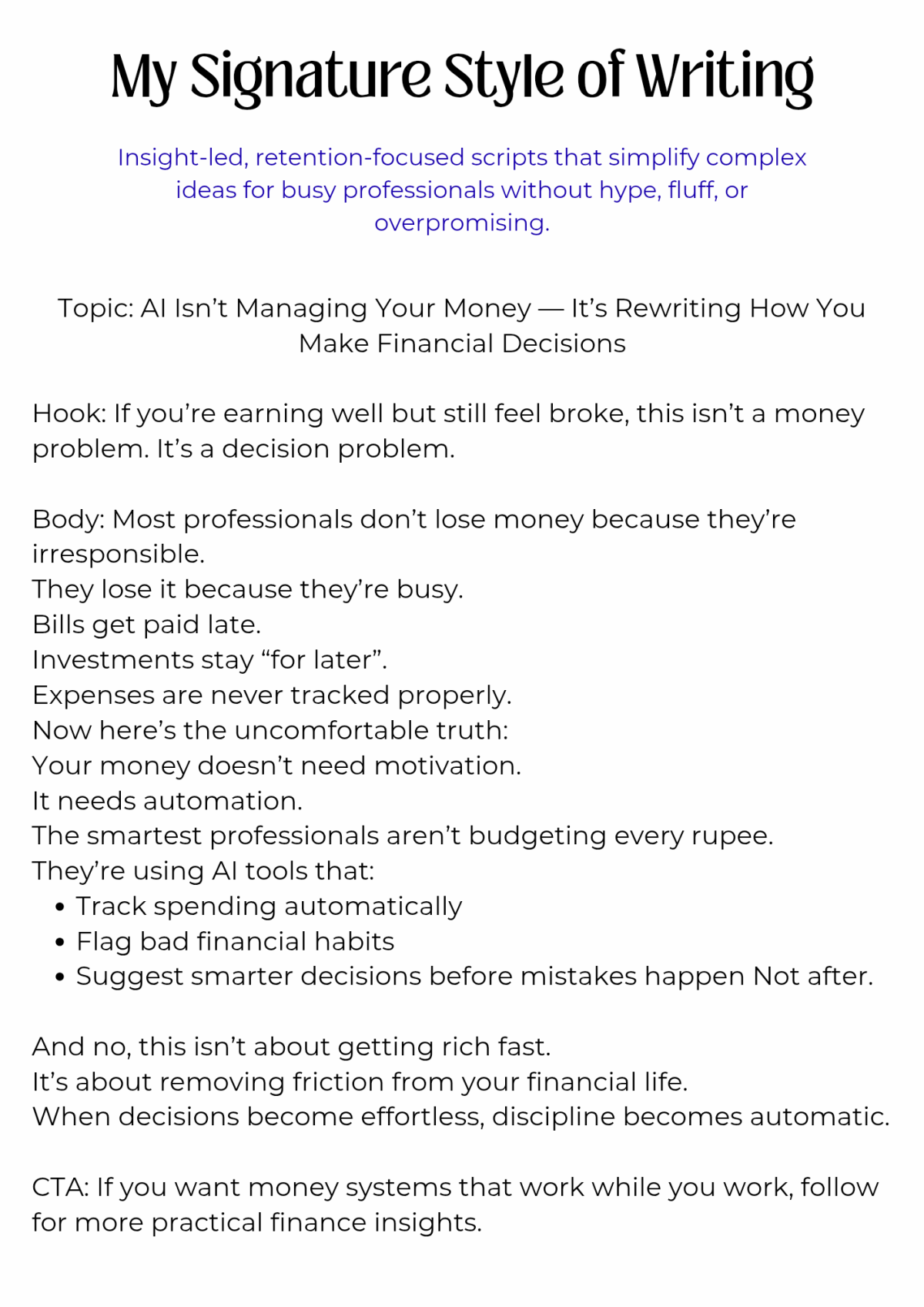 My work focuses on attention control. Every line has a purpose: stopping the scroll, creating tension, delivering value fast, and leading the viewer toward a clear action. I don’t rely on overused hooks or viral templates. I reverse-engineer audience psychology, intent, and positioning to write scripts that feel natural but perform aggressively.