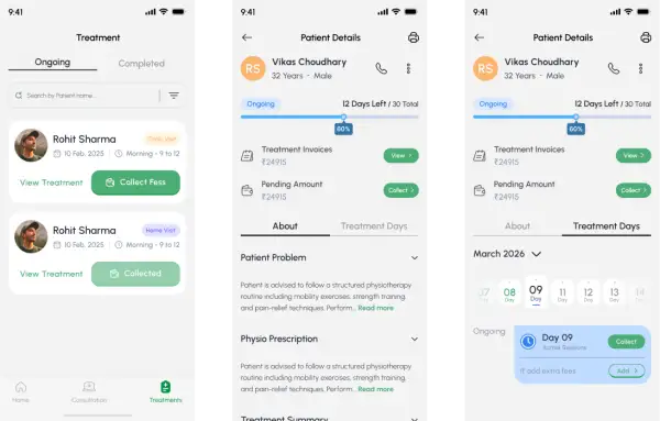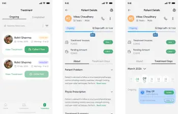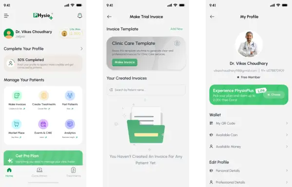 Both apps include an integrated marketplace and advanced features such as patient management, invoice creation, treatment creation, past patient records, and CME learning modules. The CME section enables webinars and learning sessions that support physiotherapists’ career growth and professional development.