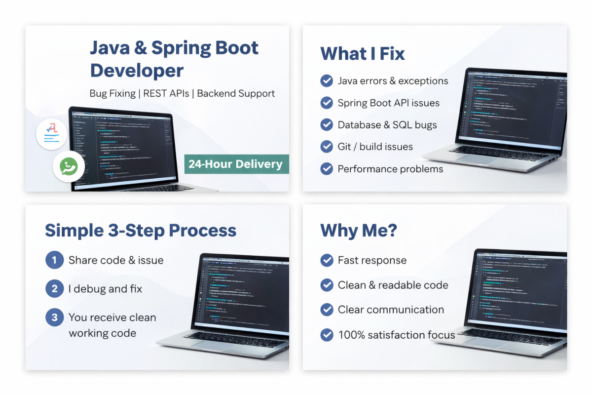 Are you facing issues with your Java or Spring Boot application? I provide fast, reliable, and professional backend bug-fixing services for developers, startups, and businesses.