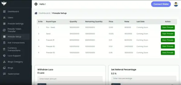 Our services cover the complete development lifecycle, including Web3 wallet integration, smart contract development, presale logic implementation, and intuitive dashboards for both users and administrators. We build systems that allow investors to securely connect their wallets, participate in presales, track contributions, and claim tokens through transparent and automated processes. On the admin side, we provide tools to monitor sales, manage users, control presale phases, and ensure smooth operations throughout the launch.