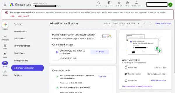 This usually happens when Google detects duplicate identity details, multiple accounts with similar information, or mismatched advertiser verification data.