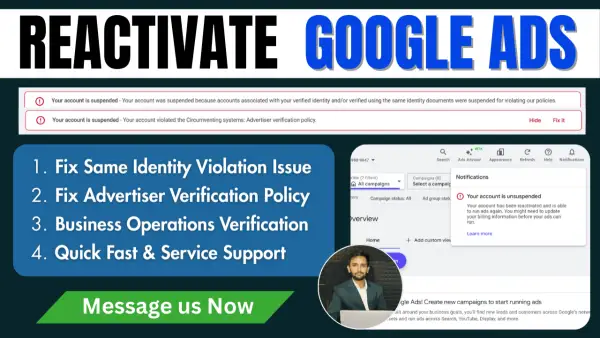 If your Google Ads account has been suspended due to identity duplication, verification failure, or inconsistent business information, our team can help you review and fix the issue using a structured and policy-compliant approach.