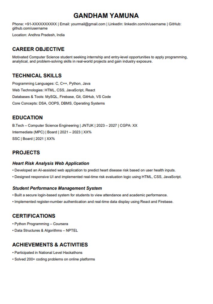 Simply share your details and desired position, and I will create a resume that increases your chances of getting shortlisted and helps you move one step closer to achieving your career goals.