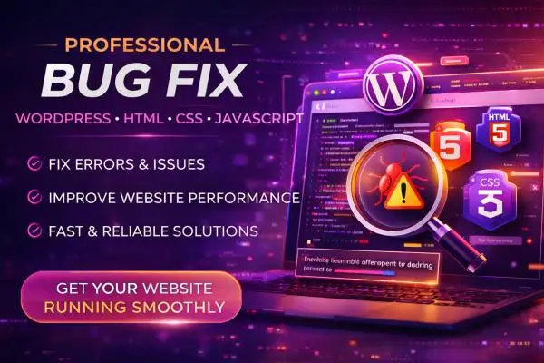 I will fix bugs, errors, and issues on your website professionally using WordPress, HTML, CSS, and JavaScript. Website bugs can affect performance, design, functionality, and user experience. I will identify the problem and provide a reliable solution to make your website work smoothly.